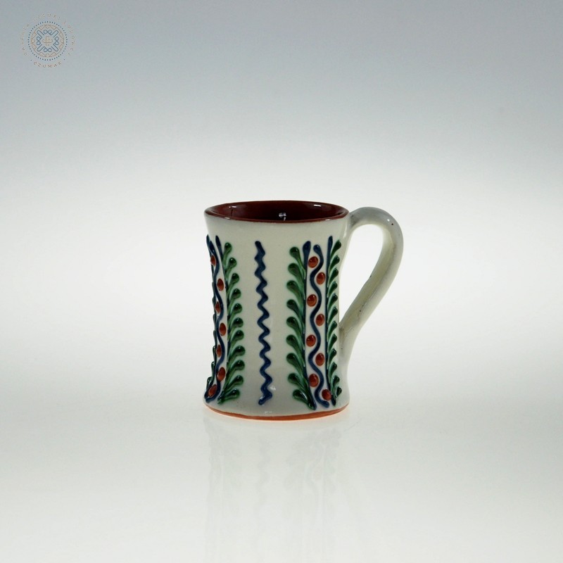 Niebywałej urody kubek będąca przykładem ceramiki z Marmaroszu. Autorska koncepcja, piękne wykonanie, nawiązanie do lokalnych tradycji i wzorów. Wypukły ornament florystyczny.