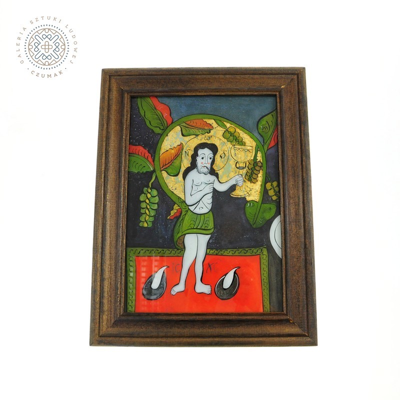Ikona ludowa malowana na szkle z przedstawieniem Jezusa Eucharystycznego. Praca znakomitej rumuńskiej artystki. Ikona nawiązuje do przedstawień ze szkoły ikonopisarzy z transylwańskiej Niculi.